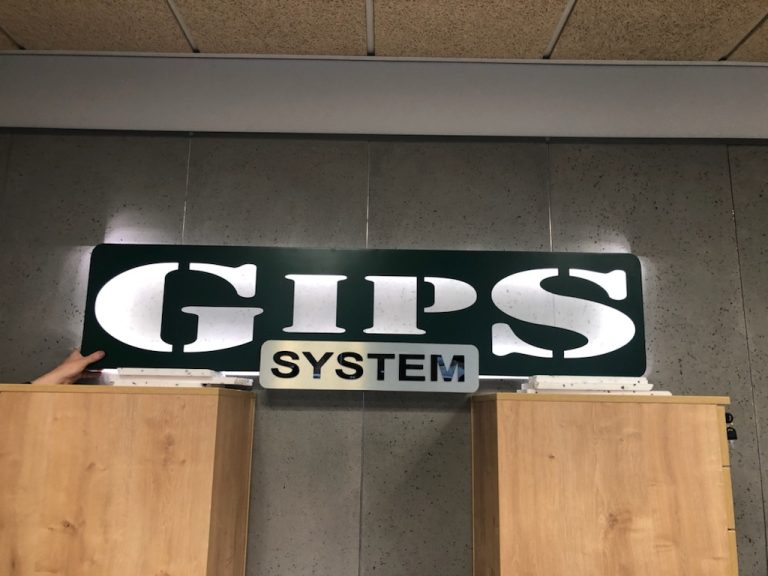 W sali – ladzie sprzedażowej zamontowaliśmy unowocześnione -odświeżone przez nas logo firmy Gips-System .