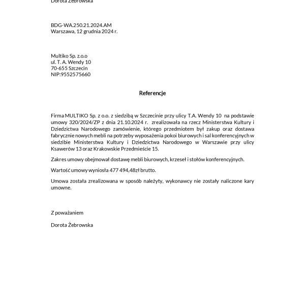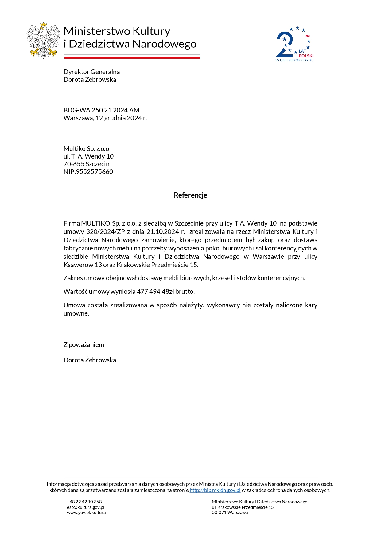 W 2024 r. wygraliśmy przetarg na wyposażenie Ministerstwa Kultury i Dziedzictwa Narodowego. Kontrakt obejmował dostawę mebli oraz krzeseł biurowych i konferencyjnych. Wartość kontraktu wynosiła niespełna 480000 zł
