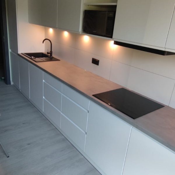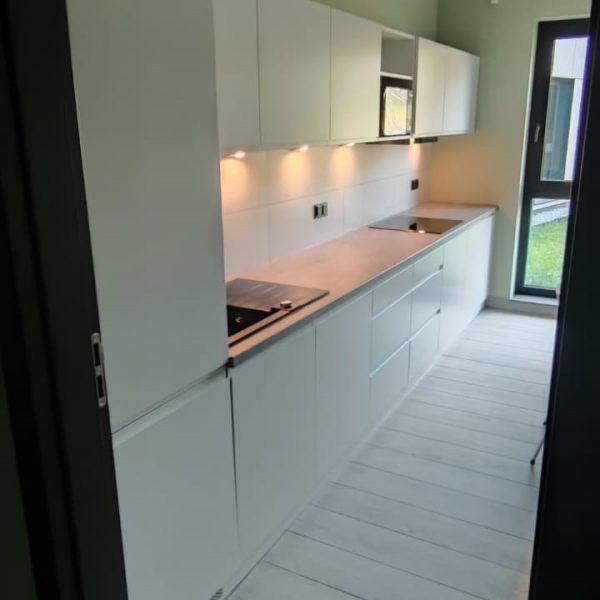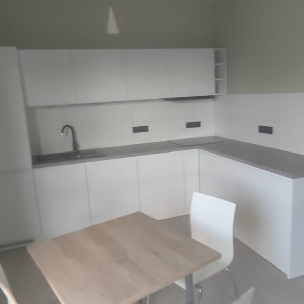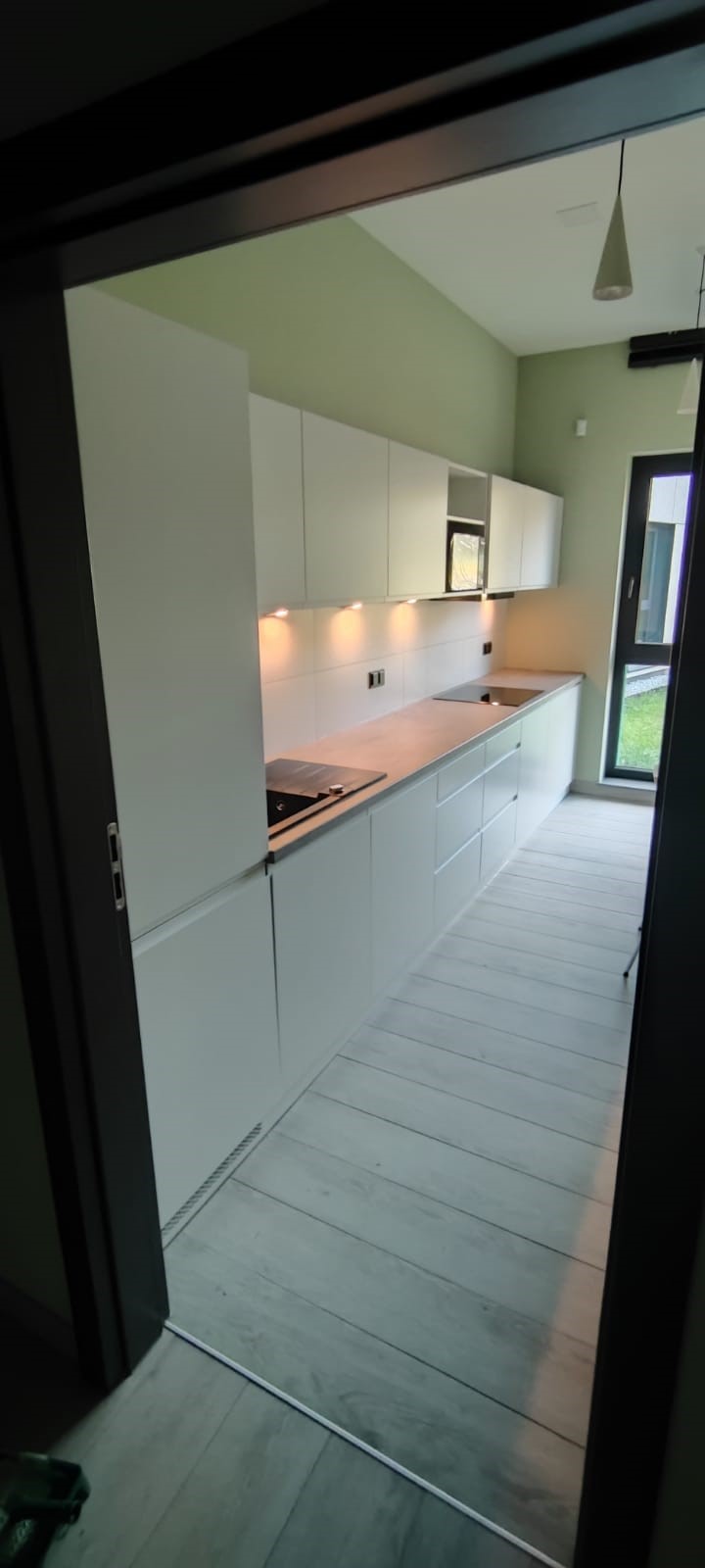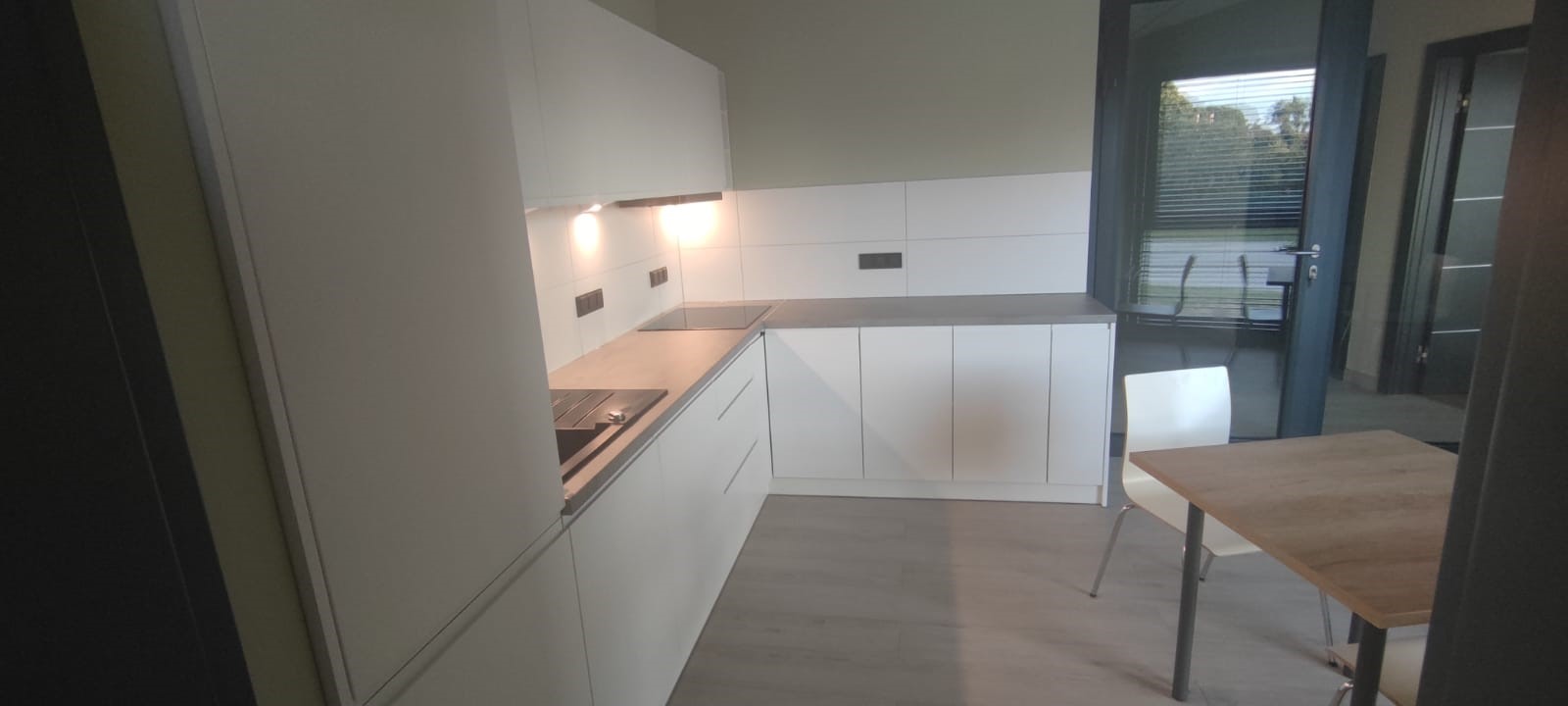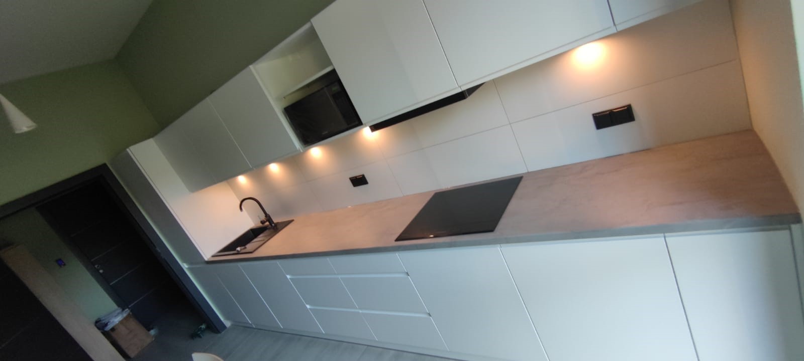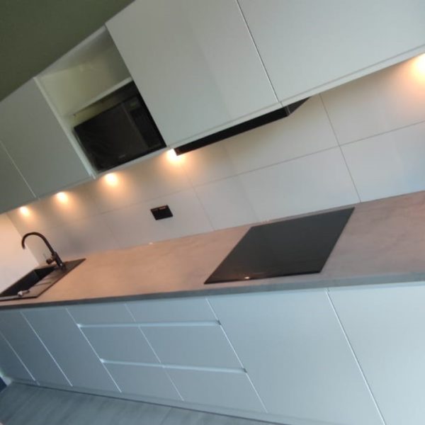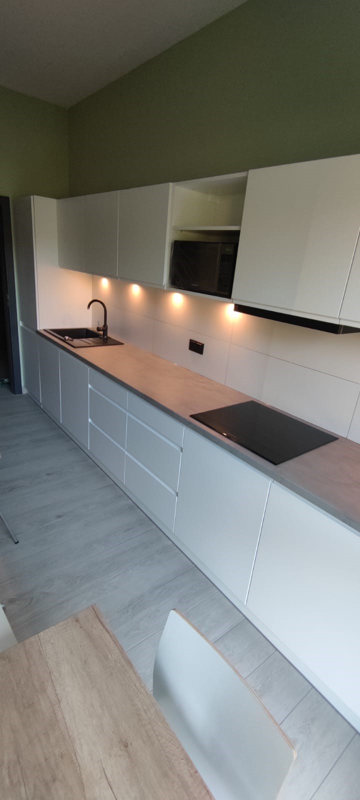 Realizacja obejmowała m.in. fronty lakierowane na wysoki połysk z frezowanym pochwytem.