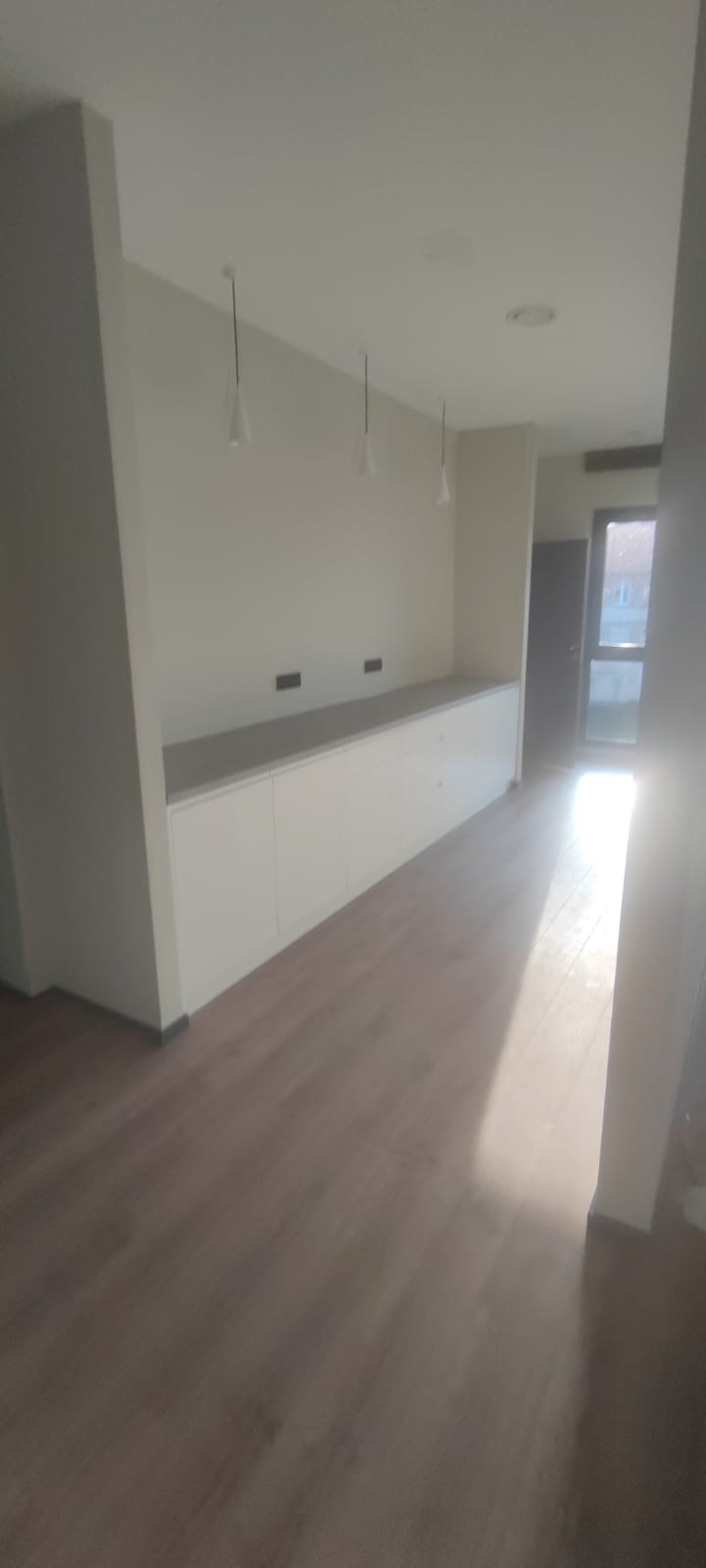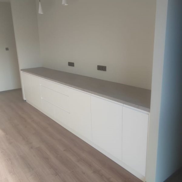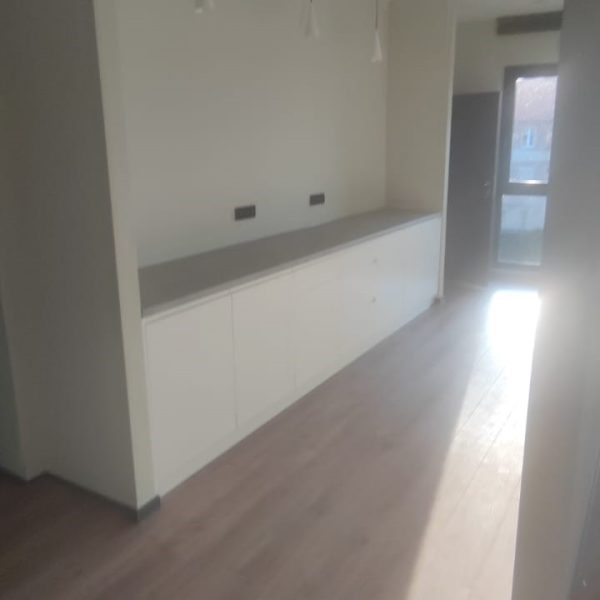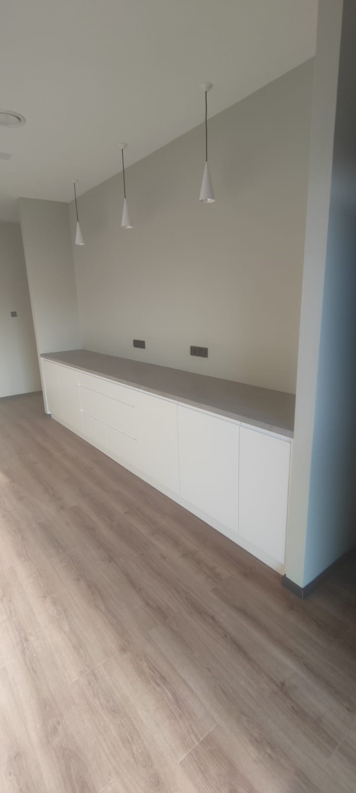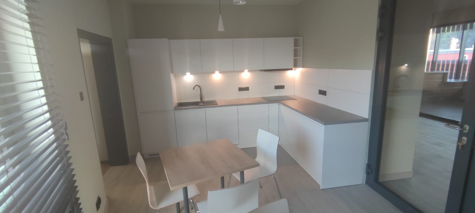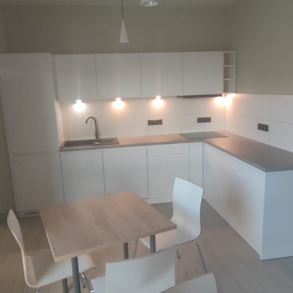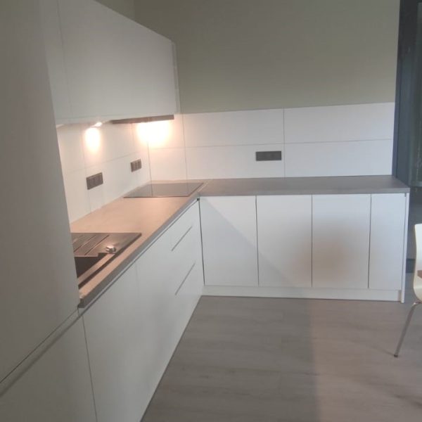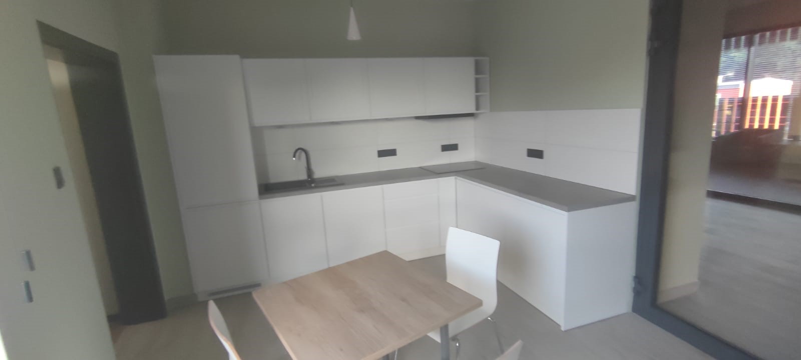 Realizacja obejmowała m.in. fronty lakierowane na wysoki połysk z frezowanym pochwytem.